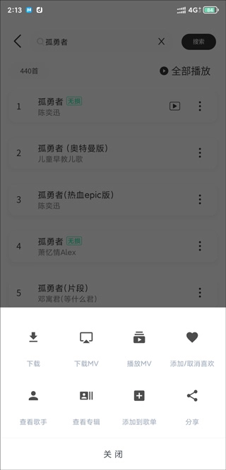 3、搜索完之后,点击歌曲右边三个点,就可以、播放、添加喜欢等操作;