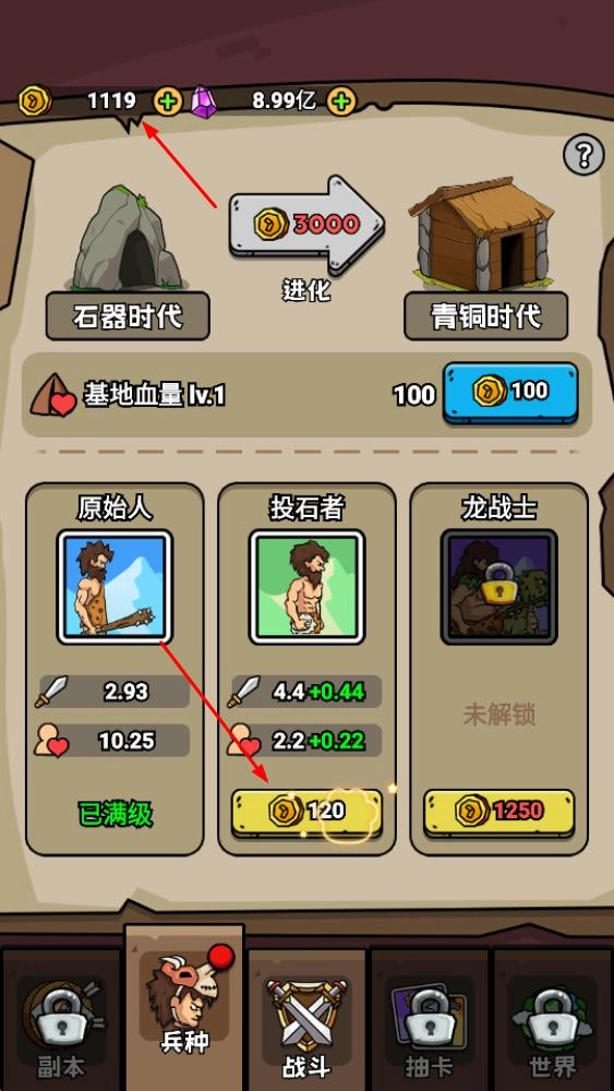 1. 在兵种界面,通过消耗金币来升级兵种,进而提升伤害、血量等各项属性,同时还能够解锁像龙战士这类高级兵种。