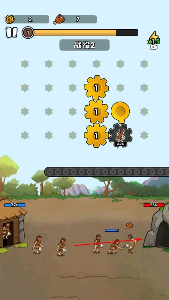 3、战役过程中,操控原始人兵种向敌方进攻,通过战斗获取金币、火腿等资源,积累进度推进战役进程。