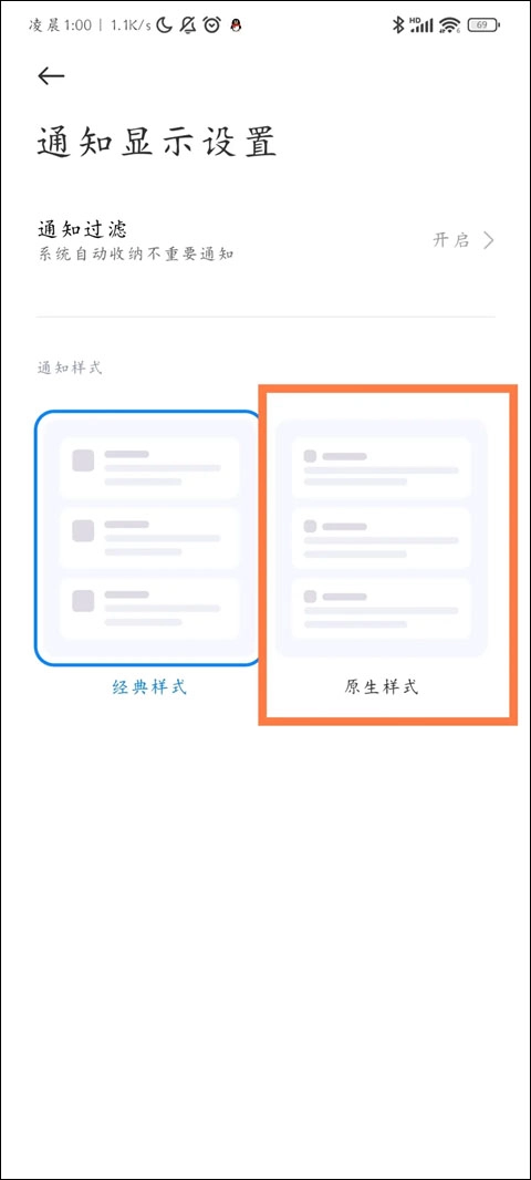 5、回到设置将通知显示设置改成原生样式。