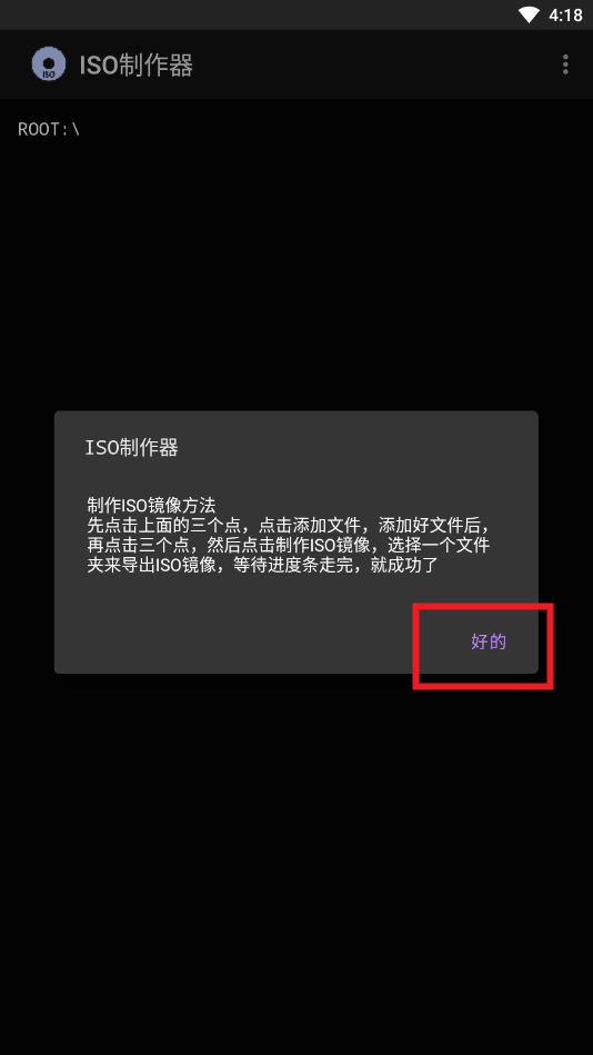 三点图标,随后从选项中选择导入文件,进而找到需要进行制作的文件。ISO文件创建:选择好文件后,用户可以输入ISO文件的名称并确认保存。