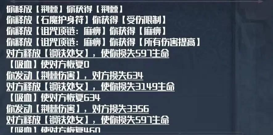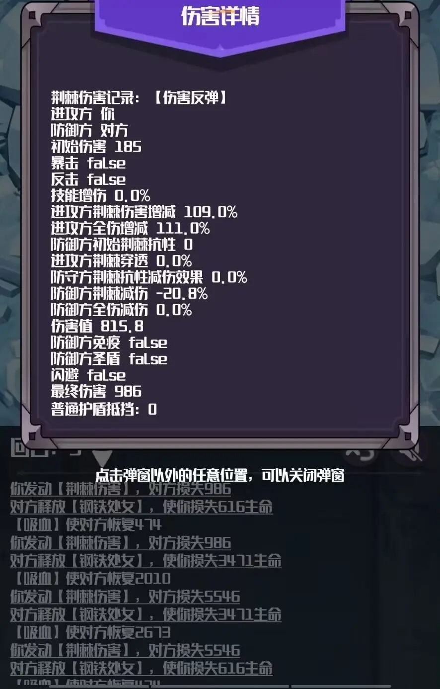 但这个游戏是从回合0开始的,回合0先双方加一堆被动状态,然后回合1开打。也就是说,被动状态不是我们或怪本身的属性,是开始战斗后,在回合0一个一个加上去的。结果在回合0时,我们在加持麻痹项链的麻痹状态或者禁疗状态时触发了对面的钢铁处女,这个时候,我们还有一堆状态没加上去呢,就被一顿白嫖,打掉了很多血,而且反伤很可能没发动(因为荆棘项链的效果还没加上去)