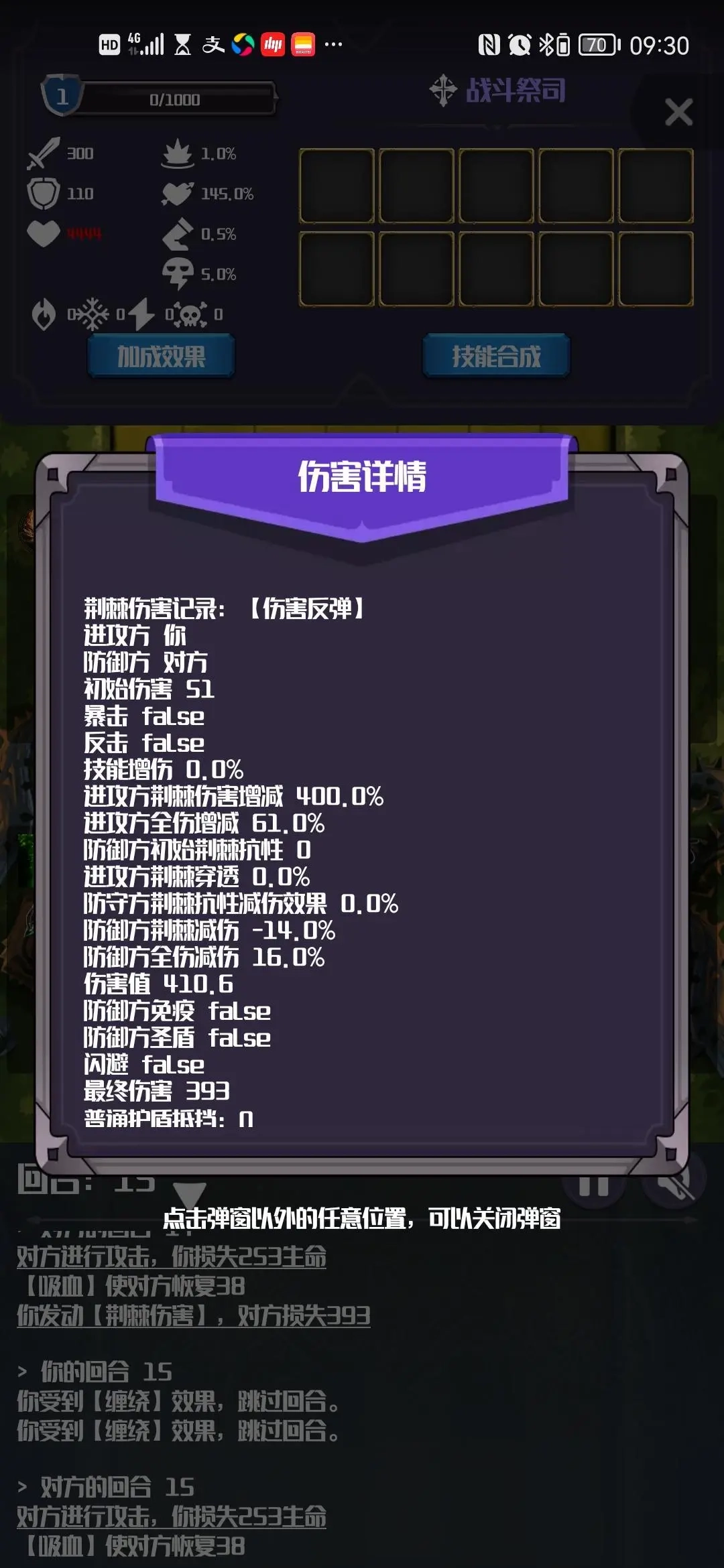 这种对拼是不公平的,因为缠绕项链加成了巨量荆棘伤害,超过了100%,反弹伤害比怪给你的伤害量还大,意味着不算加成情况下只要怪和你的总血量比小于荆棘反伤与它对你的伤害比,怪就拼不过你。这是不算其他加成哈。