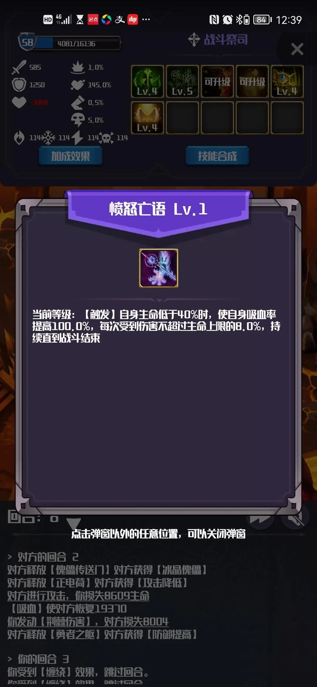 如图一,“【被动】你获得缠绕”,这句的意思是你开局就会被缠绕,持续到永远。所以你还能干什么呢?别怪我问废话,很多玩家并不清楚,我一开始也不清楚,毕竟才玩了三天,群里有位大佬解释了,缠绕状态意味着,你的回合直接跳过,无法释放主动技能,且!无法释放触发技能!(不能触发技能)