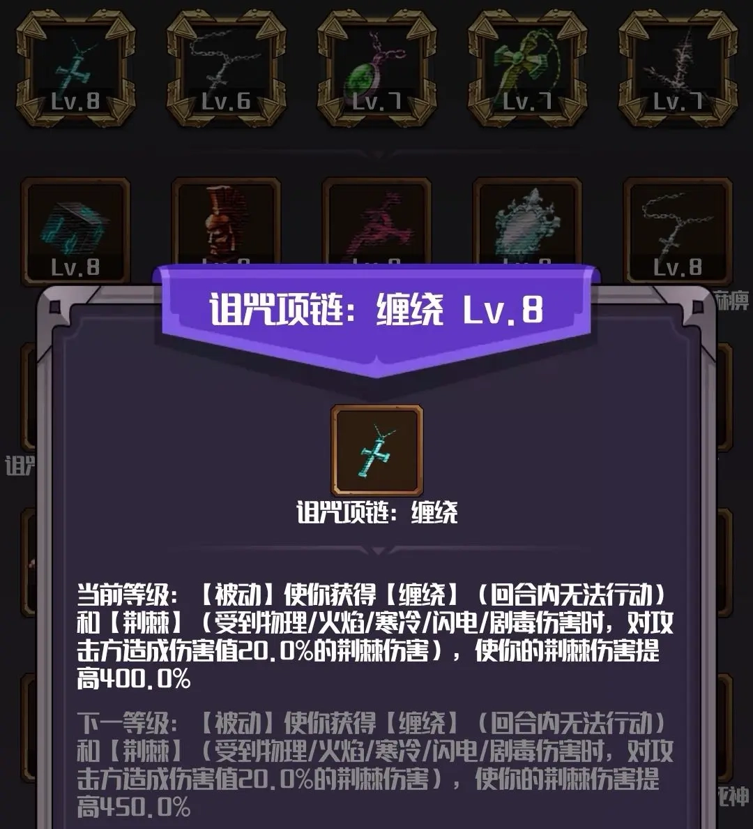 而且,没有加载缠绕项链的被动,也没有加成荆棘伤害,只是加载了你学的荆棘技能(因为荆棘技能是个特殊技能,加载优先于遗物技能加载,其他技能都是在遗物加载之后的),所以你的荆棘反伤也没啥威力: