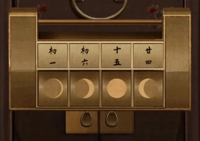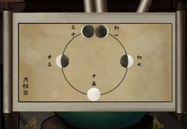 按照卷轴调整初一是右边月牙,初六约等于初七是右边半月,十五的月亮拾陆元,二十三约等于二十四是左边半月,调整完毕后床头柜打开获得一个圆形扇面。这里后退后床上会自动出现线索,就是前面厨房的线索了。