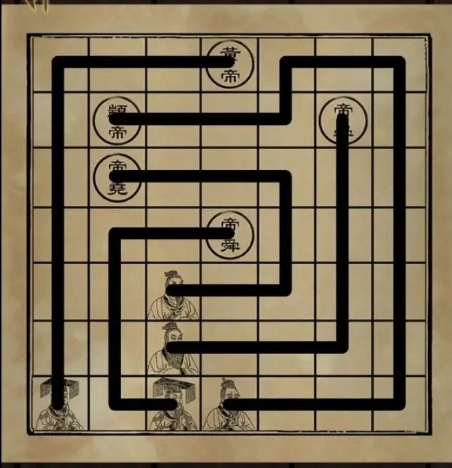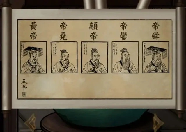 出门去院子里用香炉取水,顺手把右上角的灯点亮后回来,向桌子上的砚台加入水和墨条,然后使用毛笔就获得了蘸了墨的毛笔,调查后面墙上的挂画,这时就需要用到五帝图了,观察一下可以看出左下角是黄帝,中间第一个是帝尧,第二个是帝喾(ku4),第三个是帝舜,右下角的是颛(zhuan1)帝,自从玩了解谜游戏生僻字认识的越来越多了QAQ