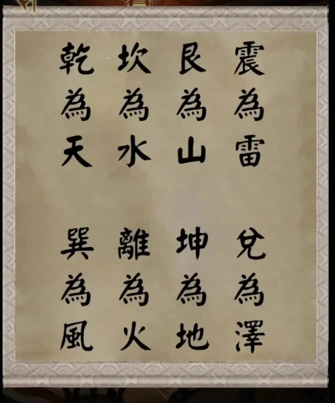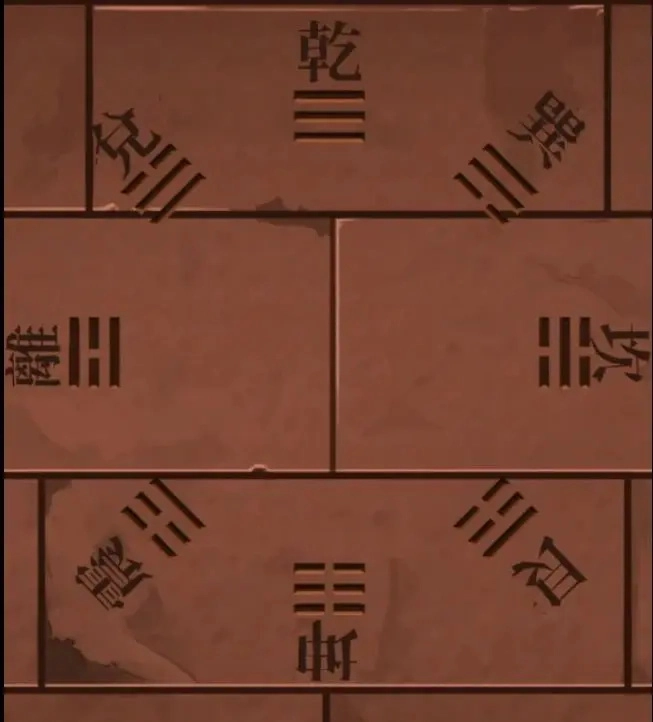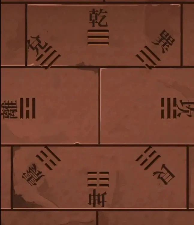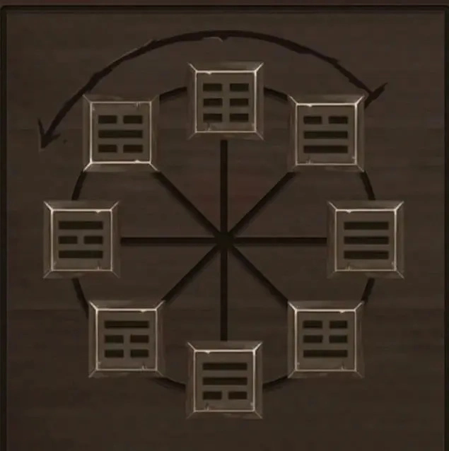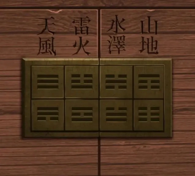 出门回到中间房间,桌子上的密码也有了头绪,从左上角逆时针顺序为兑(☱)、坤(☷)、坎(☵)、离(☲)、艮(☶)、巽(☴)、震(☳)、乾(☰)调整完毕打开抽屉拿到小玉净瓶和白色棋子。