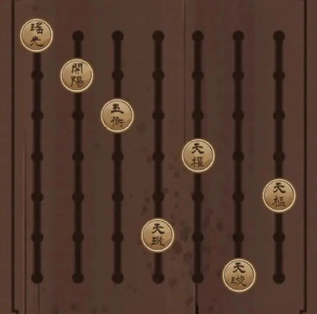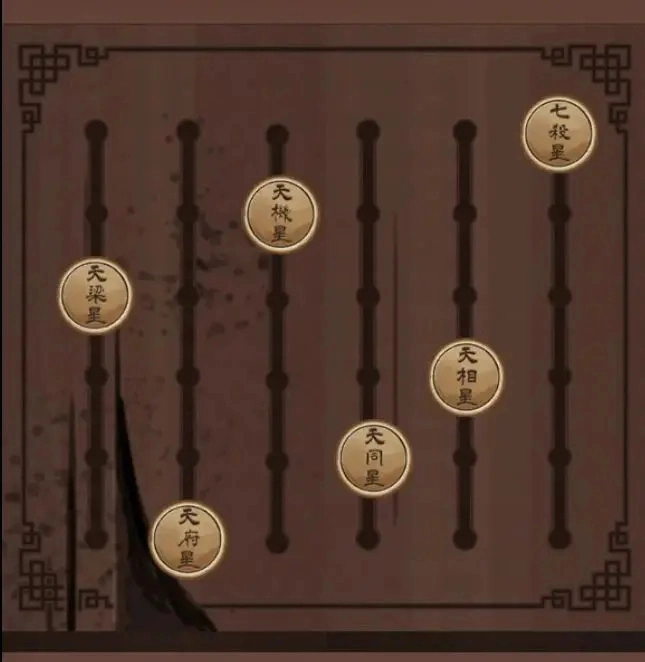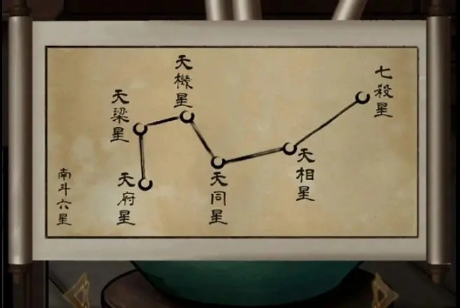 然后是南斗六星,按照从高到低的顺序依次为七杀星-天机星-天梁星-天相星-天同星-天府星,调整桌子上的盒子,注意盒子上机关的顺序和六星是不同的哦,不要看错字,调整完毕后盒子打开获得墨条。
