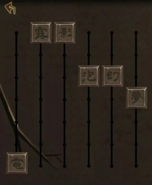 出门用火折子点燃朱雀灯(左下角),正面的房间可以进入了,进门桌子后面全是诗词,数一下发现都是7个字的,周围只有地面上的谜题是7个位置,所以在地面上找出这几个对应的字数即可,第一个电在从左边数第一个牌子右边第7个,露在第二个牌子第1个,影在第三个牌子第1个,泡在第四个牌子第3个,幻在第五个牌子第3个,梦在第六个牌子第4个。