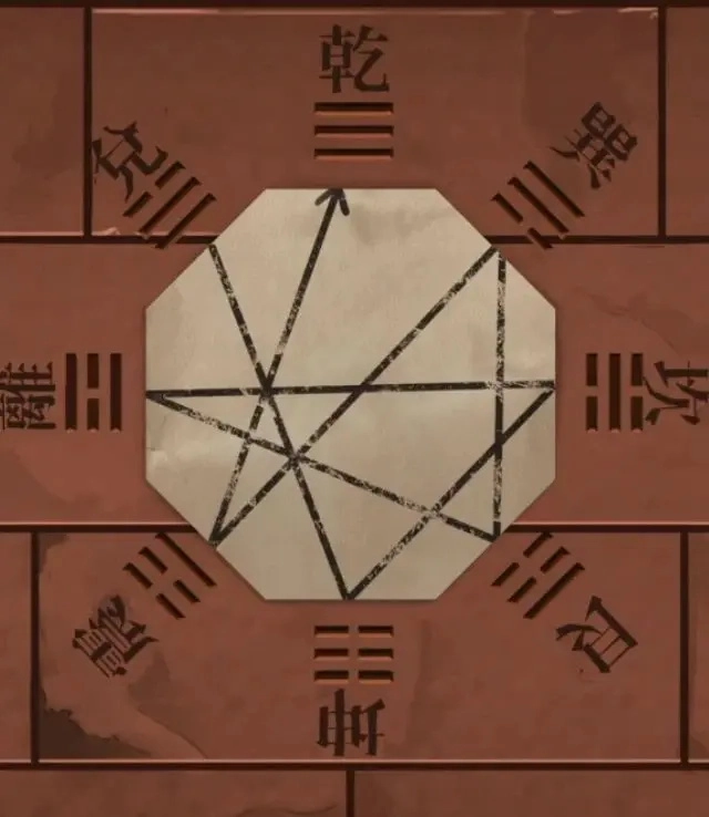 再出门来到右边的厨房,在灶台查看一下八卦,把六边形纸放上后按照纸条的箭头顺序记下来八卦为兑(☱)、坤(☷)、坎(☵)、离(☲)、艮(☶)、巽(☴)、震(☳)、乾(☰)。