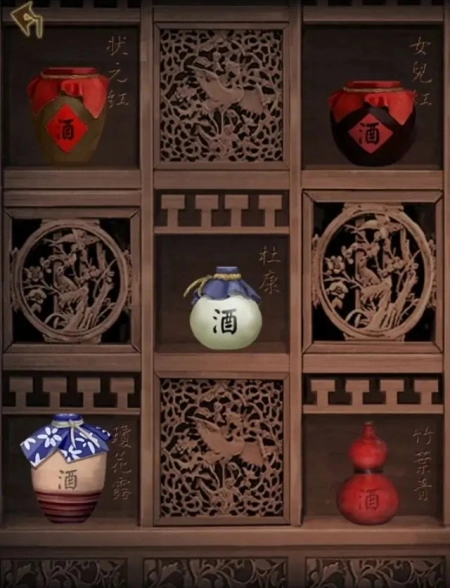 对照一下记录和招牌能看出来第一个葫芦形状的是竹叶青,第二个没贴纸的圆罐子是杜康,第三个有贴纸的矮罐子是女儿红,第四个有贴纸的高罐子是状元红,第五个没贴纸的高罐子是琼花露,回到二楼进屋调整一下让酒和后面的名字对应上就能移动酒柜露出后面挂画,也就是左上贴纸高罐,右上贴纸矮罐,中间白罐,左下蓝花罐子,右下红葫芦,打开后点一下挂画后面就是暗格,剧情后拿走匕首。