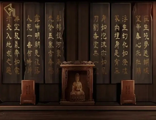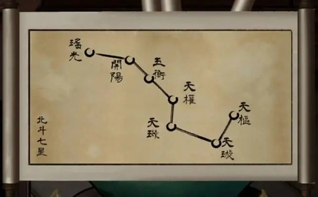 给菩萨雕像放上玉净瓶和柳枝后右边门打开,进入调查,书桌旁边的画卷可以翻页,分别是五帝图、月相图、七星图,后面用到的时候再看,当然如果有纸和笔先记下来也可以~桌子上的香炉拿走,新水桶+1。在桌子右边有两个密码盒,这里就需要对应一下了,首先是北斗七星,按照从高到低的顺序依次为瑶光-开阳-玉衡-天权-天枢-天机-天璇,注意盒子上机关顺序和七星顺序不同哦,调整盒子后获得毛笔。