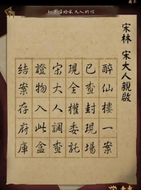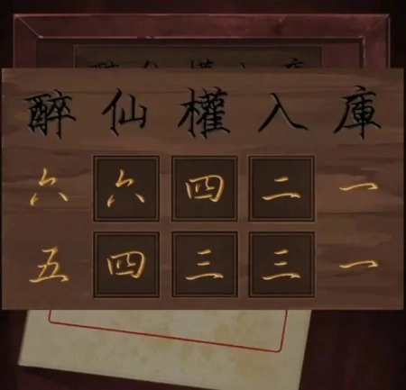 出门在走廊尽头有个盒子,调查一下有一封信,盒子上的字对应信上的位置就是密码,按照规律第一个字醉是65也就是从左下角作为起点先数x轴再数y轴,看一眼盒子上的字是醉仙权入库,数一下依次是65/64/43/23/11,调整一下打开盒子放入匕首完成。