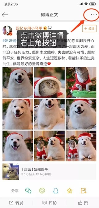 1. 打开软件,此处以微博为例,操作均为“复制链接”。在微博的详情页面里,点击右上角的按钮。
