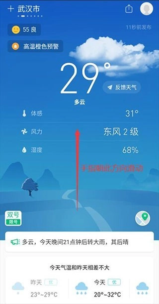 1. 进入彩云天气主界面后,用手指由下向上滑动屏幕,直至显示出下方的详情内容。