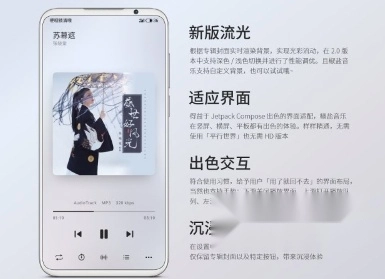 3、再来看看听歌界面,歌曲界面由两部分组成,一面是专辑封面一面是歌词,这两面让你在听歌时不会觉得很单调。在专辑那一面会显示歌曲的格式类型和码率,对于音乐发烧友来说这项功能还是很特殊的。歌曲播放时的界面为,高斯模糊的流光,可以在设置里设置流光的效果,例如主题和流光效果的强弱。
