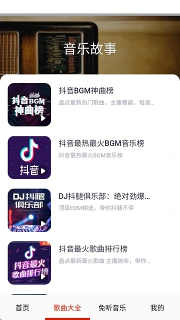 免听音乐不支持显示歌词,仅仅是一个音乐播放的平台,拥有丰富的典库和榜单。