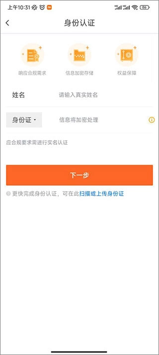 3、在这里输入真实姓名和身份证,点击下一步即可认证。