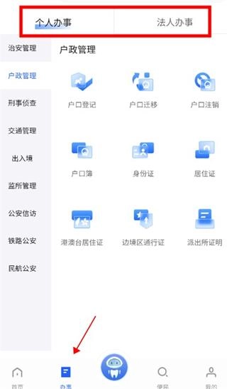 2、点击“办事”,这里有个人办事和法人办事,可以选择自己想要的服务;