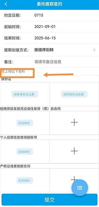 4、下拉到需上传以下资料处,按提示上传资料后点击提交,