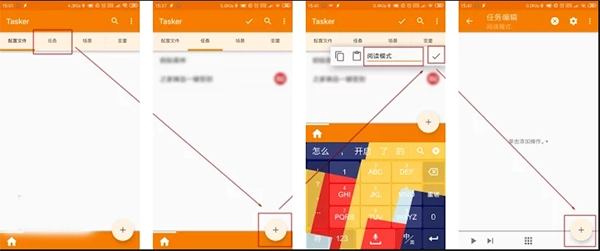 主界面切换到“任务”栏,点击右下角“添加”键(加号),输入任务名称,点击右边确认“”键(对勾)。这时我们已经成功创建一个任务了,只不过是空的,接下来我们要在其中添加操作。