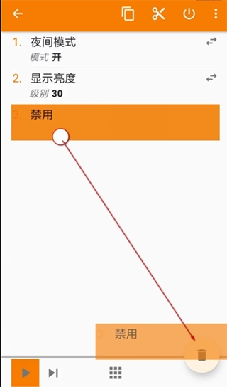 至此我们的任务已经创建完成了,点击左下角的“play”键可以运行,预览一下是否成功,中途步骤如果出错可长按操作拖动调整位置,拖到加号处的垃圾桶可删除。