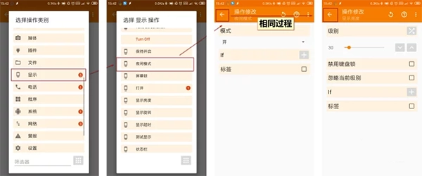 点击右下角加号,选择操作类别“显示→夜间模式”,将说模式调整为“开”,点击左上角返回,或点击导航键、手势返回,在Tasker中返回既是保存。同样的操作,找到“显示→显示亮度”,将级别调整为在夜间比较舒适的亮度,返回保存。