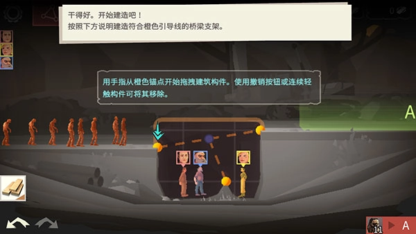 4、接下来按照下方说明建造符合橙色引导线的桥梁支架,用手指从橙色锚点开始拖拽建筑构件。
