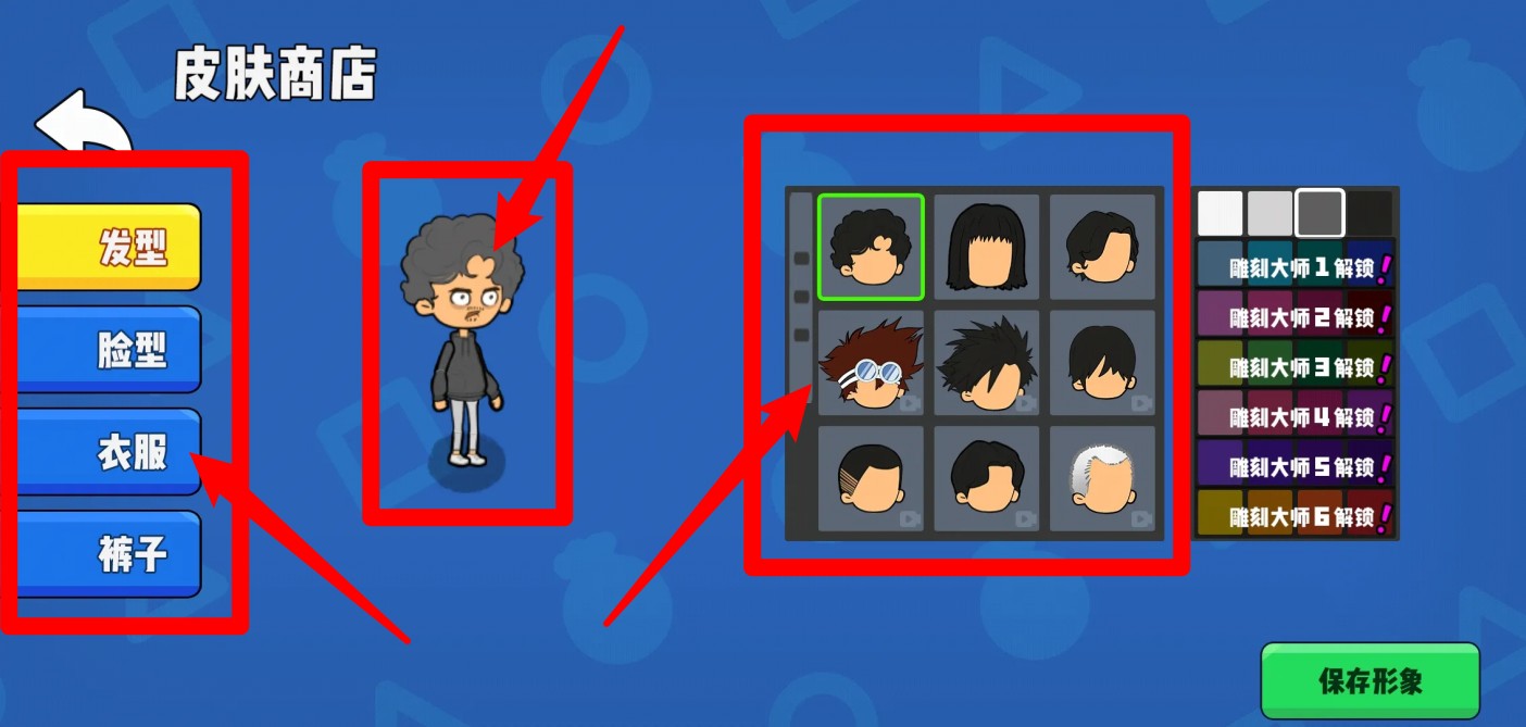 2. 轻点左侧菜单,即可进入发型、脸型、衣服以及裤子等自定义选项界面,在右侧挑选造型,就能预览并随心所欲地切换组合搭配。