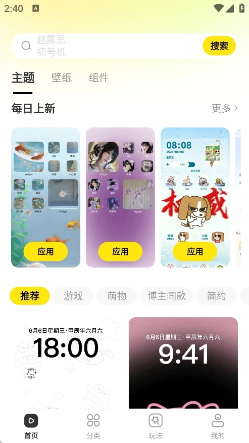 1. 安装该软件,其首页包含众多精彩主题、壁纸与组件,此外还有推荐、游戏、萌物等板块。