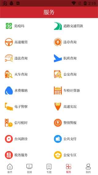 4、【服务】:服务页面包含了市民朋友经常可以用到的服务项目,如防疫码、违章查询、水费缴纳等。