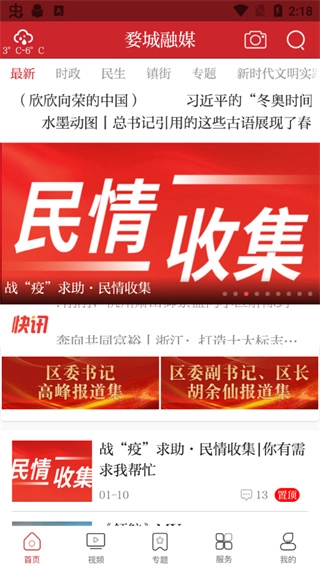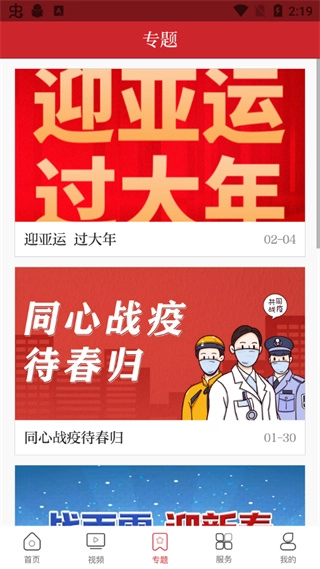 3、【专题】:此页面显示的是软件所推出的特色专题板块,其中包含的一般是热点事件,如迎亚运过大年和同心战疫待春归。