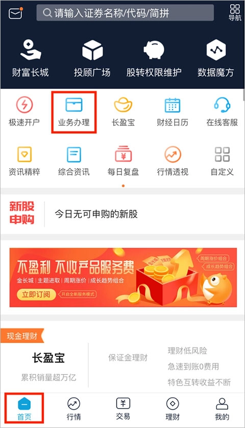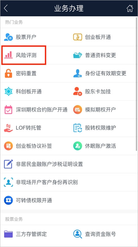 打开长城易软件,在首页找到并点击“业务办理”-“风险评测”,随后依照提示进行操作就行。