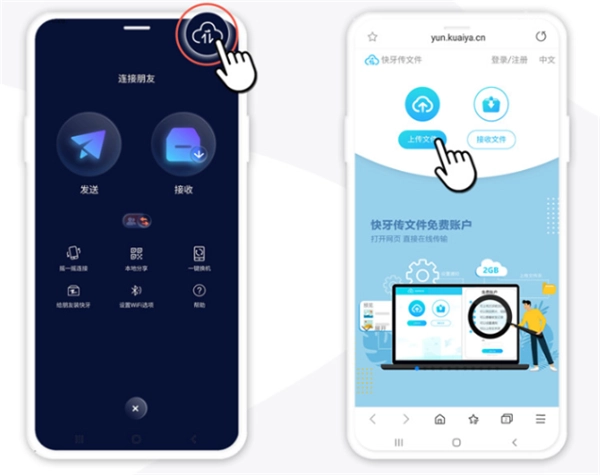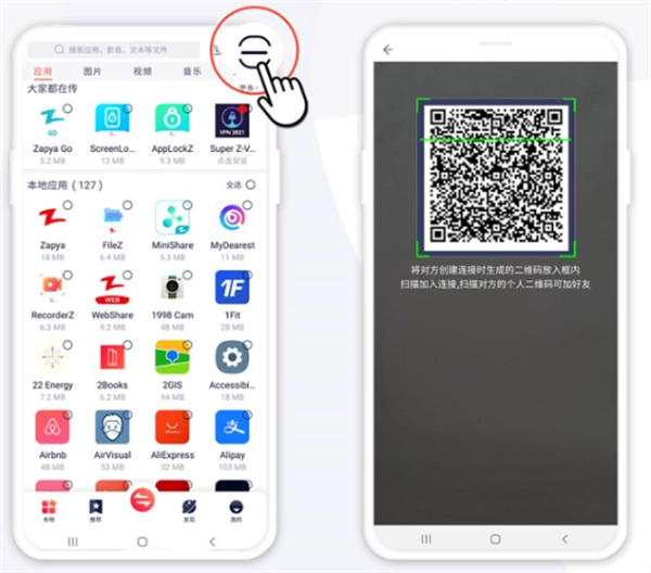 进入首页,点击下方导航栏传输按钮。进入传输界面。手机A选择接收,手机B选择发送,手机B在发送界面选好文件,然后点击发送。手机B在雷达扫出的结果里选择手机A,或者直接扫手机A的二维码,A和B就直接连接上并自动发送