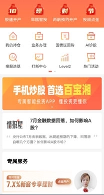 湘财证券精心打造的百宝湘,乃是公司全新推出的新一代一站式智能金融服务平台。该平台于极速行情数据、高效交易体验、智能投资工具、专属服务体系以及综合资产配置等多个业务领域迅速展开布局。新平台在确保快捷与安全的前提下,秉持场景化业务设计理念,全力为用户提供一站式专业化综合金融服务。凭借在金融科技领域卓越的创新能力与突出表现,湘财证券百宝湘荣获券商中国“2018券商创新突破奖”。