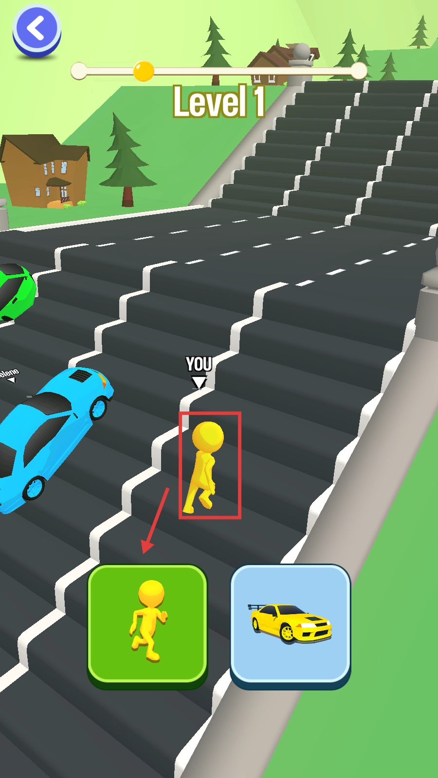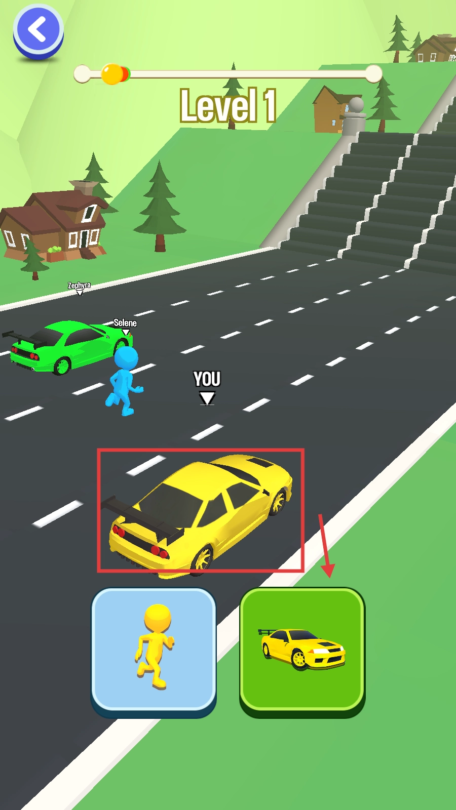 1. 踏入游戏Level1,于平坦的路段,轻点下方绿色汽车图标,使角色变身为黄色车辆,迅速驶过此路段。