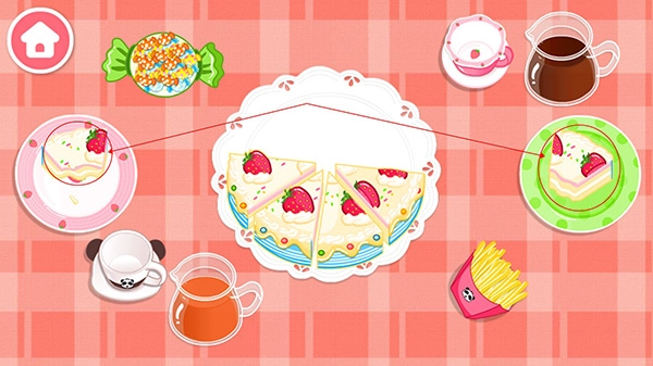 宝宝需要动动手把蛋糕放在餐盘上,美味的蛋糕需要用饮料来搭配