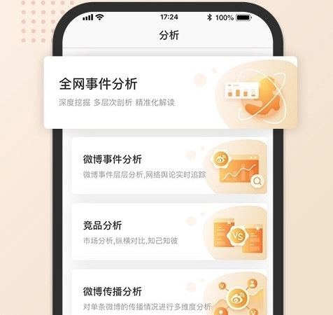 6、划分了不同的分析栏,有全网事件分析,微博事件分析,还有竞品分析与微博传播分析。