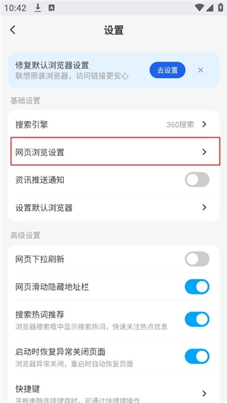 3、然后选择网页浏览设置;