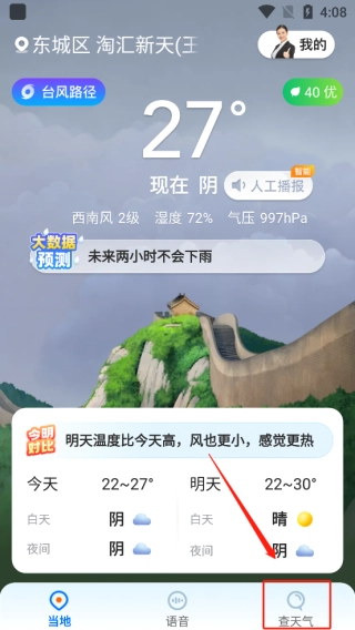 1、即刻快速安装瑞奇天气,点击下方“查天气”按钮。