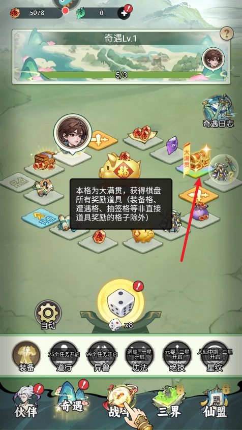4、走到“大满贯”格子时,玩家将获得当前棋盘上所有道具的奖励(不包括装备)。