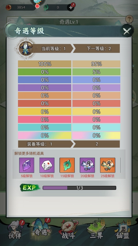 5、通过闯关和奇遇等活动,玩家能收集愿力石,用于提升主角和伙伴的等级,进一步增强团队实力。