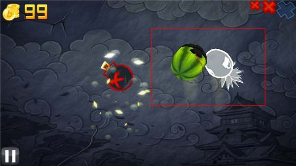 5、切到炸弹不会导致游戏结束,不过会让当前屏幕上的所有水果都消失,同时扣除10分。(要是一局里切到三个及以上炸弹,说不定会有惊喜哦!?BombLover+50)
