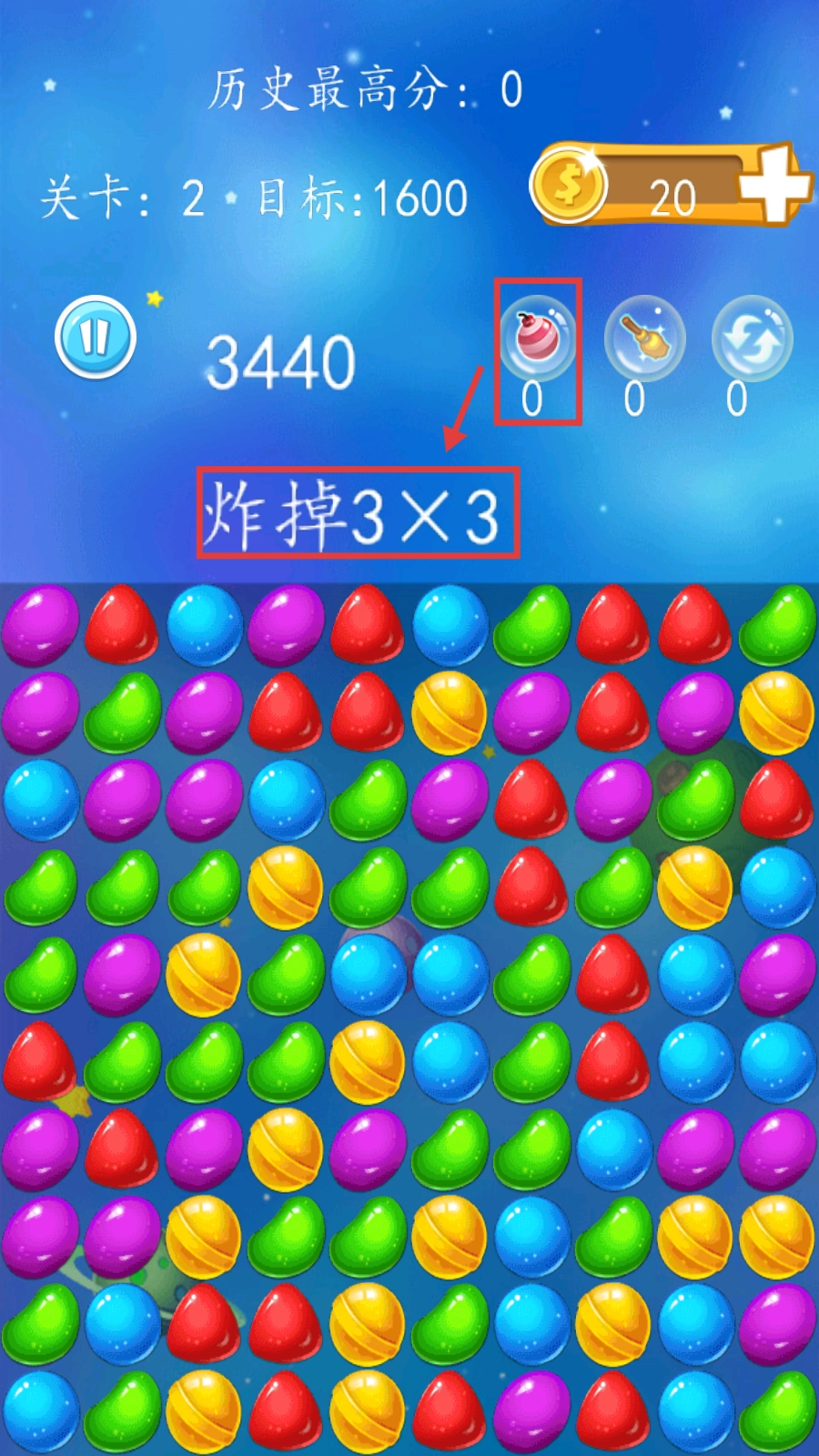 3、在关卡2中,点击【炸弹道具】,它能炸掉3乘3区域的糖果,帮我们快速达成消除目标。