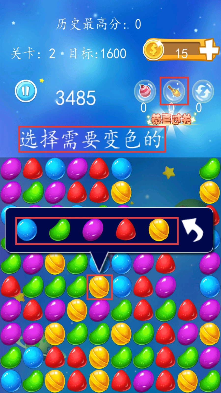 4、接着用【变色道具】,选要变色的糖果,再点击对应颜色即可改变,来创造更多消除机会。