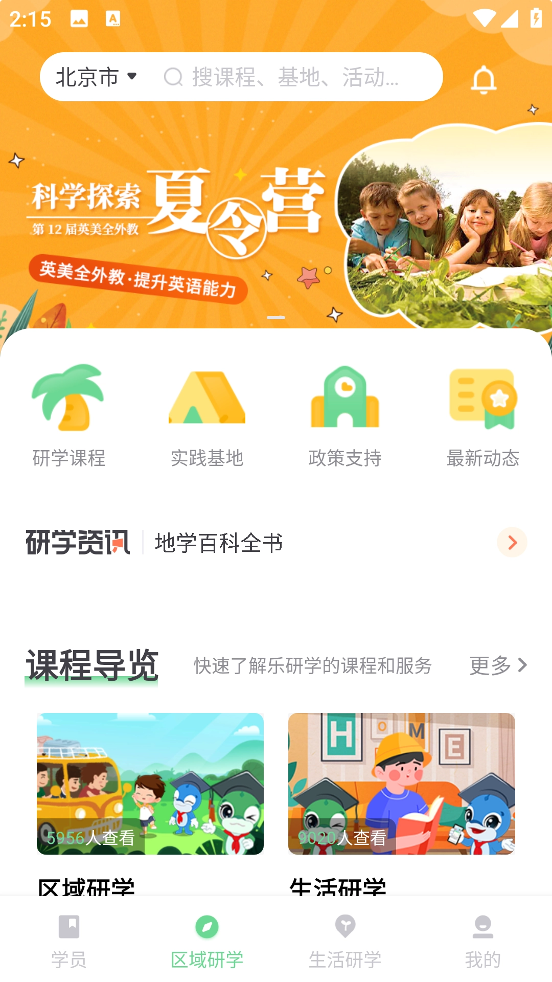 2、登陆账号后点击区域研学,可查看各地的研学基地
