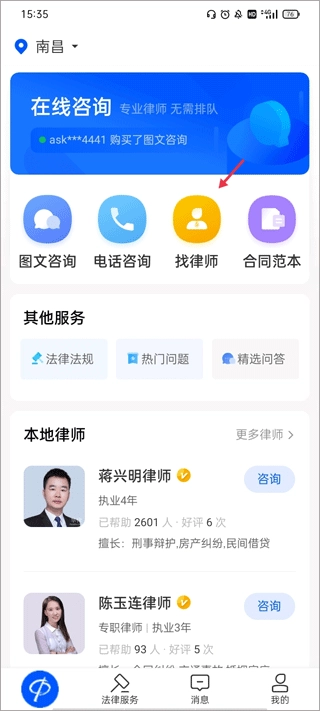 1. 打开华律法律咨询,默认会进入主界面,此时点击上方的“找律师”选项。