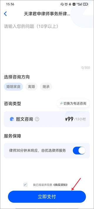 3、详细阐述你想要询问的法律问题,选择咨询方向与咨询类型,勾选“购买须知”后点击立即支付即可,随后会有专业律师为你解答相关疑问。