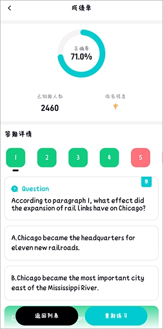 7、完成后软件会自动打分,绿色表示正确,红色表示错误,下滑查看错题解析。
